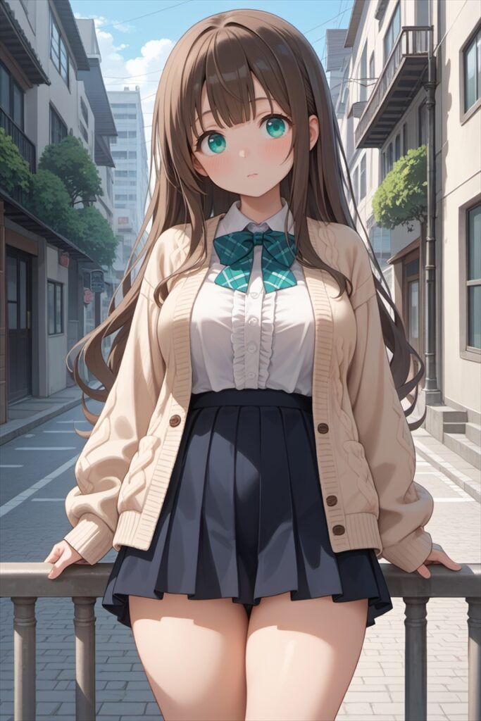 - 服装:collared shirt, pleated skirt, knit cardigan, school uniform(シャツ、プリーツスカート、ニットカーディガン、制服)