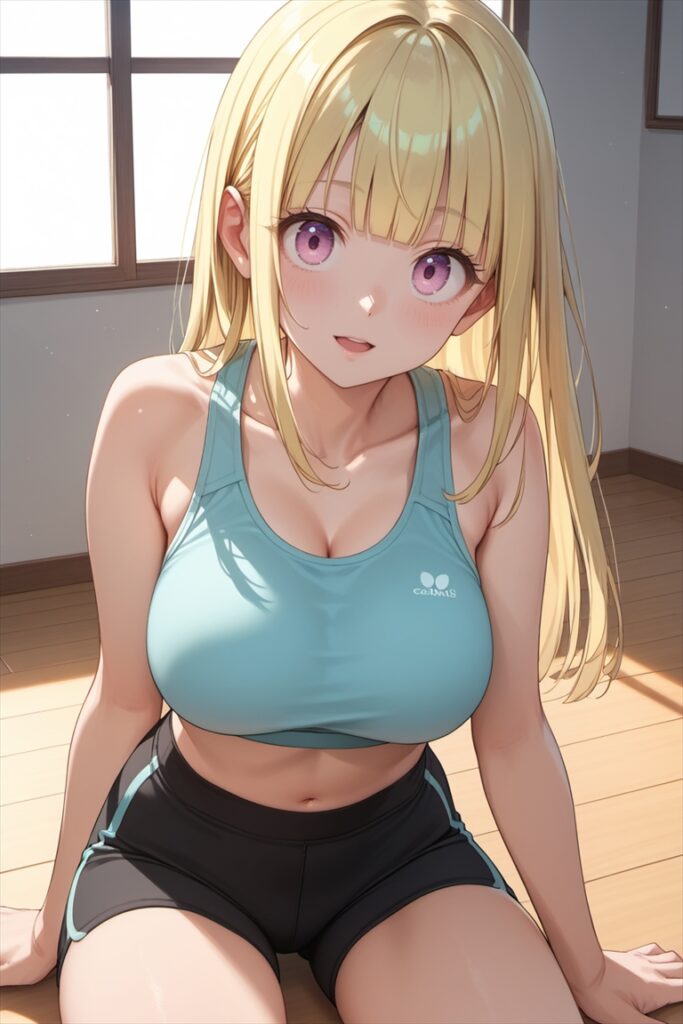 - 服装:sports bra, gym shorts(スポーツブラ、ジムショーツ)