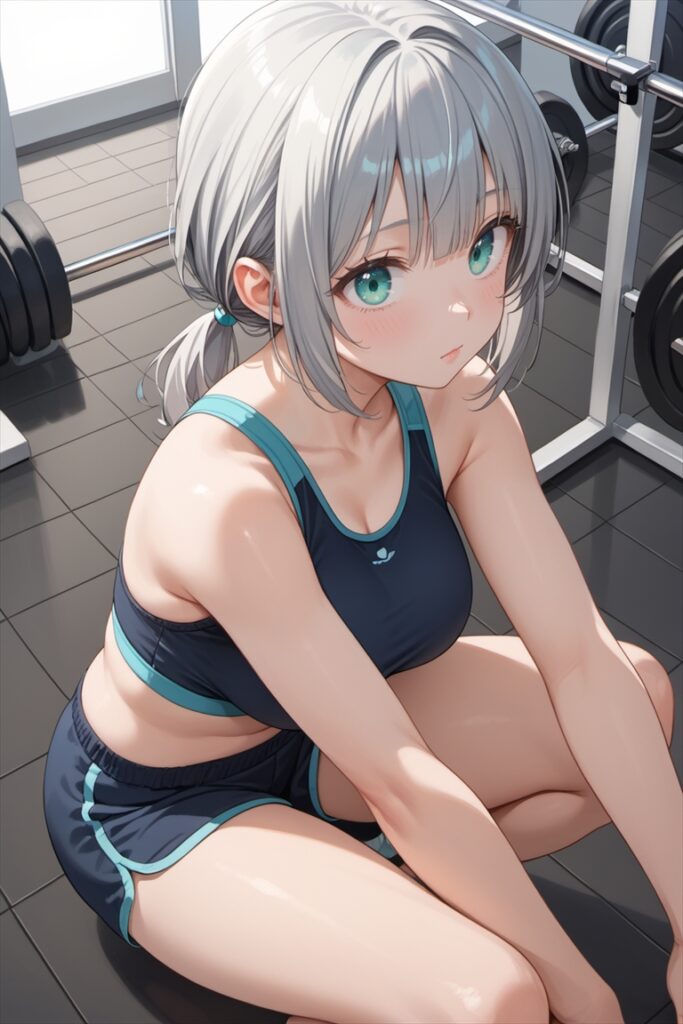 ジムでトレーニング中のむちむち太ももの女の子を生成するプロンプトとエロいAIイラストです。