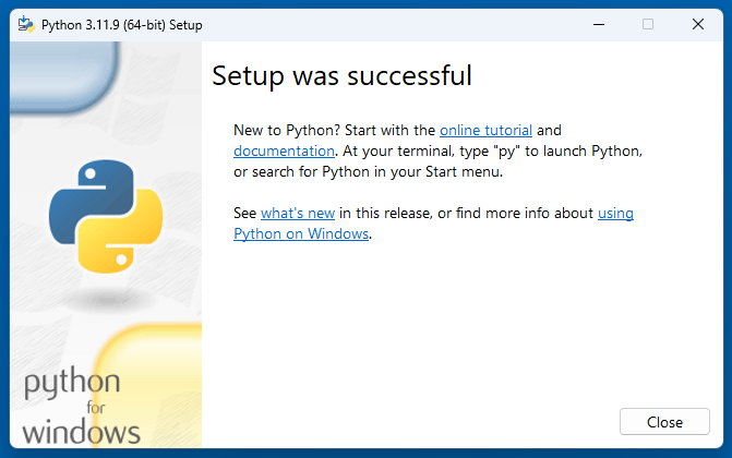 Setup was successful と表示されたら、インストールは完了です。「Close」で画面を閉じます。